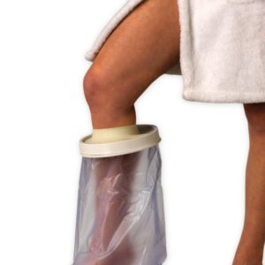 - Osłony na nogę (dolną kończynę): Podobnie jak w przypadku rąk, mamy do wyboru krótsze ochraniacze zakrywające nogę do wysokości kolana oraz długie, które sięgają aż do biodra. Jeżeli gips znajduje się poniżej kolana (np. usztywniona stopa, kostka lub goleń), wygodny i wystarczający będzie ochraniacz do kolana. Przy opatrunku obejmującym udo lub całą nogę (np. złamanie kości udowej z opatrunkiem gipsowym ciągnącym się przez kolano aż do uda), należy wybrać wersję długą, sięgającą okolic biodra. Taka osłona zakryje całą kończynę od stopy aż po udo, dając możliwość bezpiecznej kąpieli nawet z bardzo rozległym opatrunkiem. Ochraniacze na nogi są zwykle na tyle szerokie, by można je było nałożyć na stopę z gipsem, a następnie naciągnąć w górę nogi.