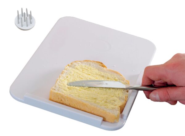 Trwała jednoczęściowa deska z podniesionymi bokami w kształcie litery „L” w jednym z rogów. Dodatkowo wyposażona w „uchwyt” na produkty spożywcze. Nieodzowna pomoc kuchenna dla osób z osłabioną sprawnością rąk.